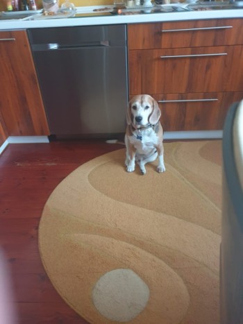 Nieufny niski pies z obrożą brązową i popielatą przeciw kleszczą