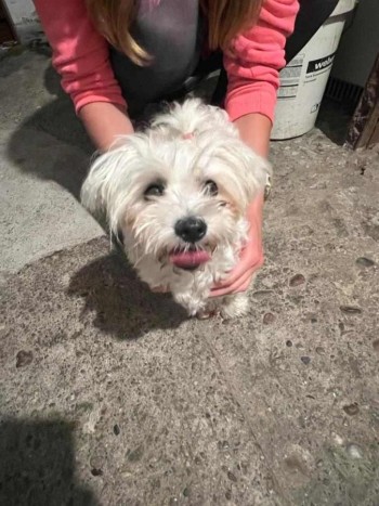 Biały maltańczyk, dziewczynka. Różowa gumeczka. Bardzo przestraszona, znaleziona na ul. Raczkowskiej, czeka cierpliwie na swojego właściciela.