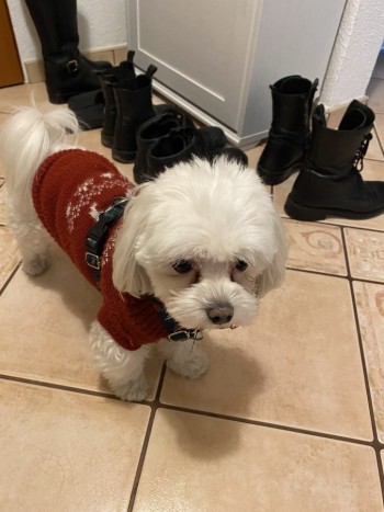 Biały malutki piesek, ma czerwony sweterek i zielone szelki