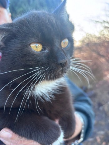 Czarny, wyjątkowo długie białe wąsy. trochę białego na na szuji i na łapkach. przyjazny bardzo (przylepa). uwielbia człowieków.