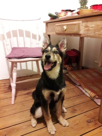 szczeniak kilkumiesięczny, spore szpiczaste uszy, nieco krzywe tylne łapy, maść czarna podpalana