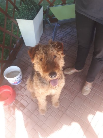 Umie komendy: siad i stój, młody pies, posiada kolczatkę z bryloczkiem od weterynarii LIKAON w Szamotułach. Pies rasowy Airedale terrier.