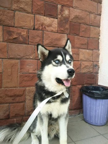 Pies rasy Husky, czerwona obroża, bez mikroczipa