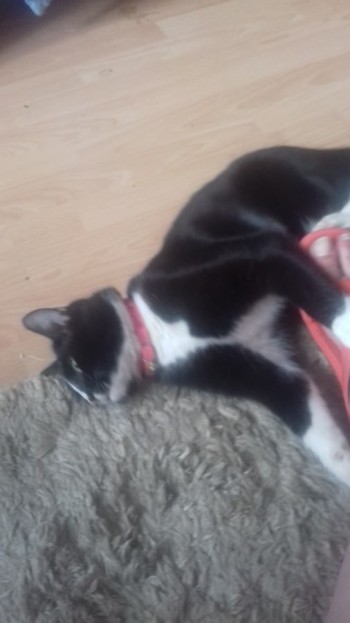Jest to kotek czarny z białym krawatemu. Ma na obrożywo nr telefonu który nie jest aktywny