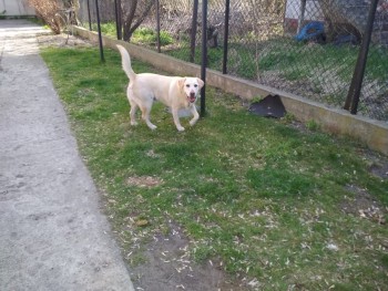 Biszkoptowa sierść, nie agresywny ,długi ogon, zielona obroża z czipem
