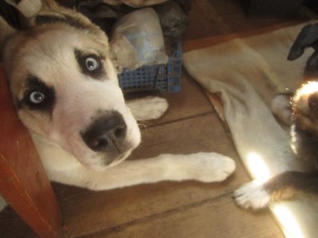 Szczeniak typu Huskey. Wiek ok 3-4 miesiąca. Ubarwienie jasne z szarym. Obwódka oczy czarna. Na ogonie charakterna plamka. Specyficzny, łatwy do rozpoznania brzuszek.