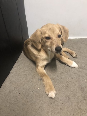 Nieduża, młoda, biszkoptowa suczka. Kuleje lekko na tylną łapkę.
