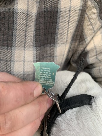 Piesek ma przywieszke przy obroży z adresem przychodni dla zwierząt 97-500 Radomsko, ul. Wilsona 21 nr tel. 44 682 45 44